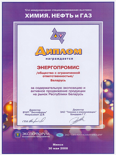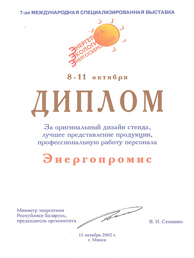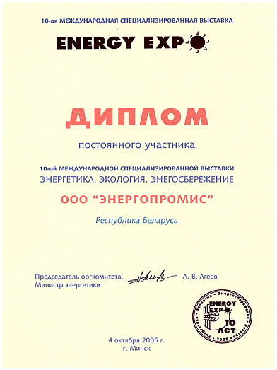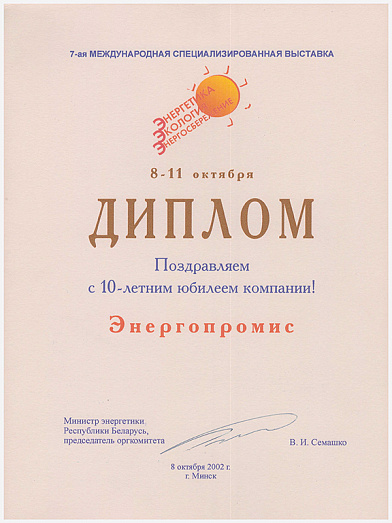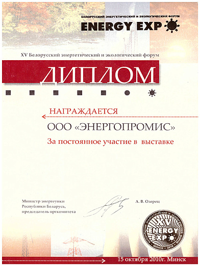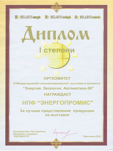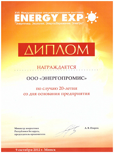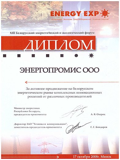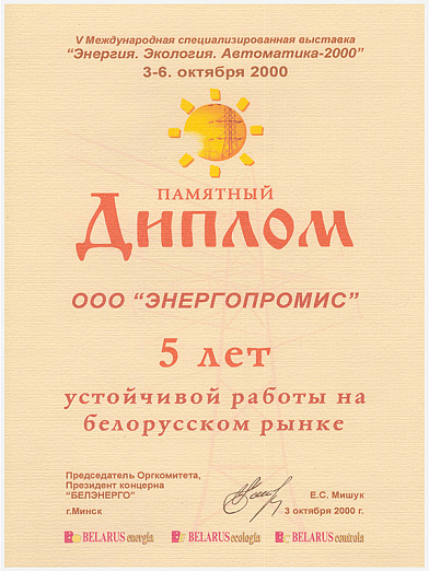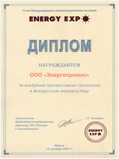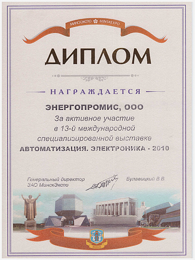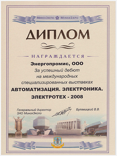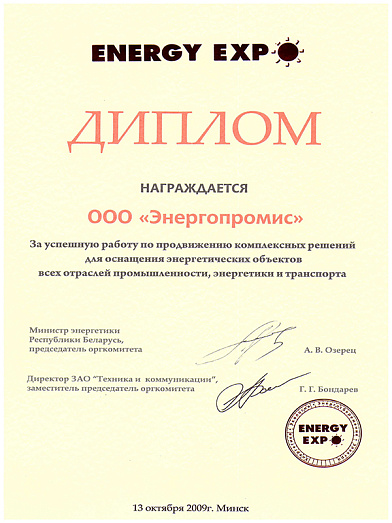 Сертификат о присвоении ООО «Энергопромис» статуса Официального партнера от 16.03.2012г. в части внедрения устройств защиты и управления производства Компании ABB.Условия данного сертификата обязывают ООО «Энергопромис» соответствовать требованиям качества ABB, как мирового поставщика товаров и услуг для автоматизации подстанций. При полной поддержке и содействии ABB (Швеция)