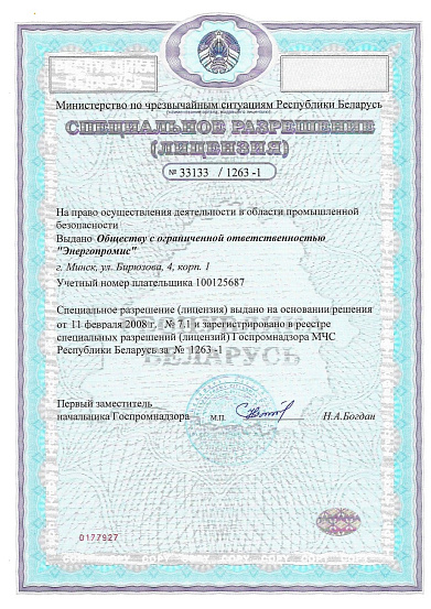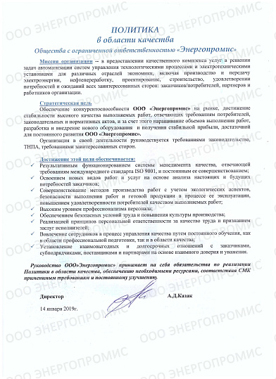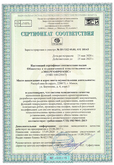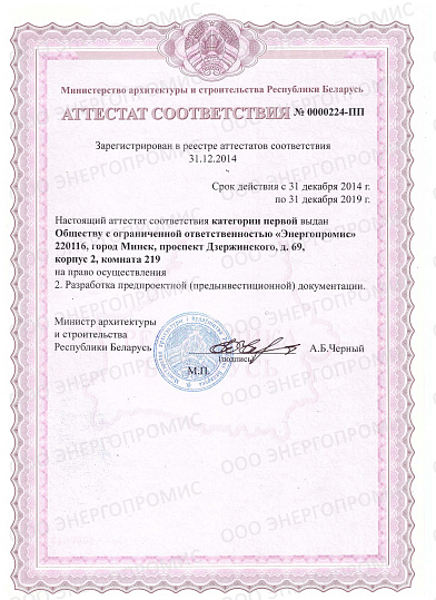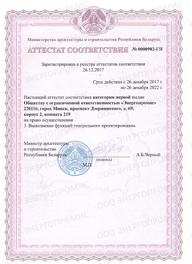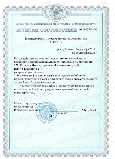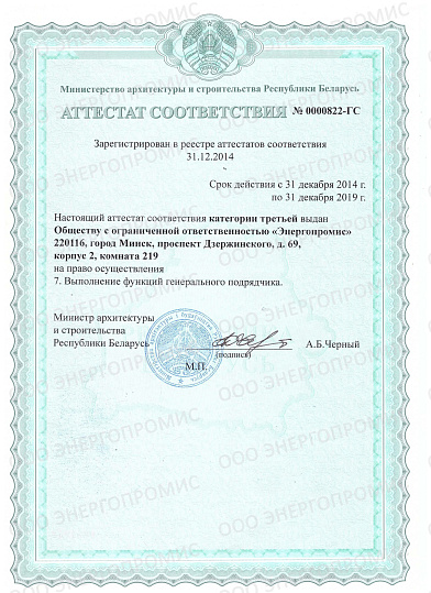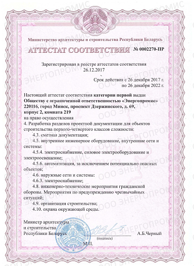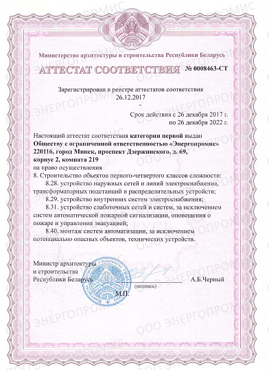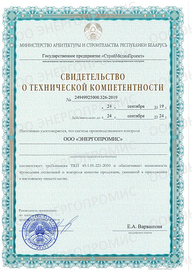 Удостоверяет, что система производственного контроля ООО «Энергопромис» соответствует требованиям ТКП 45-1.01-221-2010 и обеспечивает возможность проведения испытаний и контроля качества продукции: электромонтажные работы (устройство сетей и систем электроснабжения, электроосвещения), устройство связи и диспетчеризации инженерного оборудования, устройство систем автоматизации, линейно-кабельные сооружения электросвязи, монтаж пассивных оптических сетейНациональная система подтверждения соответствия
