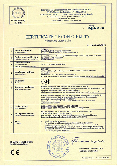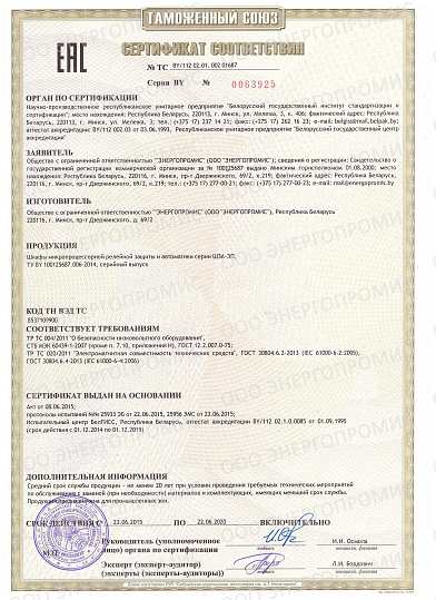 Сертификат соответствия EAC на серийный выпуск шкафов микропроцессорной релейной защиты и автоматики серии ШЗА-ЭП согласно ТУ BY 100125687.006-2014Таможенный союз. Устройства низковольтной защиты, управления и распределения серии ЭП