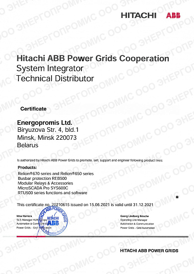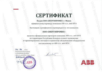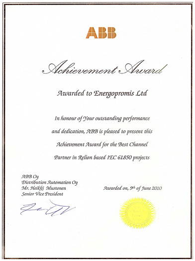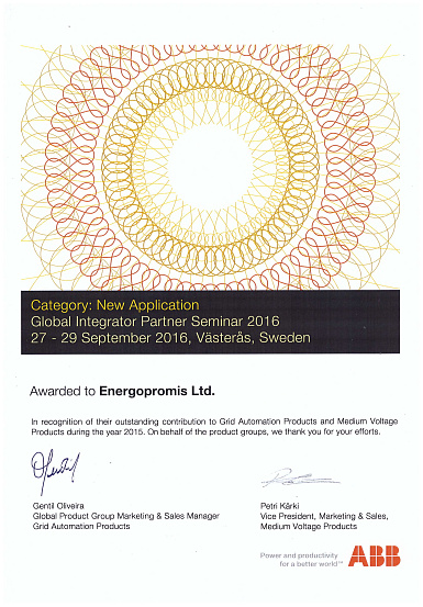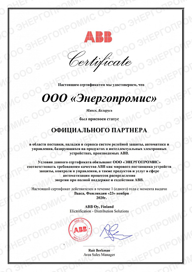Сертификат о присвоении ООО «Энергопромис» статуса Официального партнера в области продажи, поставки, наладки и сервиса систем релейной защиты, автоматики и управления, базирующихся на продуктах и интеллектуальных электронных устройствах, производимых ABB.Условия данного сертификата обязывают ООО «Энергопромис» соответствовать требованиям качества ABB как мирового поставщика устройств защиты, контроля и управления, а также продуктов и услуг в сфере автоматизации процессов распределения энергии. При полной поддержке и содействии ABB