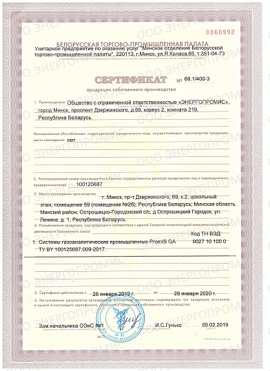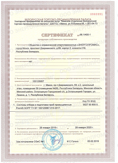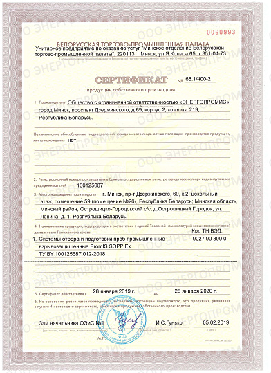Сертификат собственного производства на системы отбора и подготовки проб промышленные PromiS SOPPБел ТПП. Системы газоаналитические промышленные взрывозащищенные PromiS GA Ex