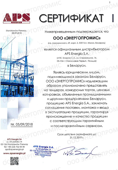 Сертификат от 05.09.2018 г. удостоверят, что ООО «Энергопромис» является официальным дистрибьютором APS Energia S.A. на территории Беларуси в сфере промышленности и энергетики.ООО "Энергопромис" аттестовано в качестве нашего сервисного центра для обеспечения гарантийного и послегарантийного обслуживания продукции APS Energia S.A. на территории Республики Беларусь