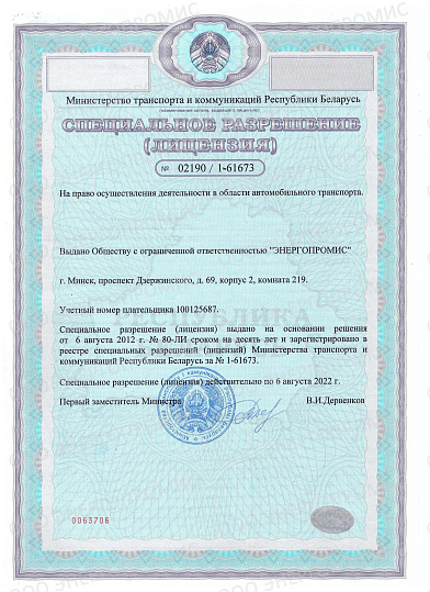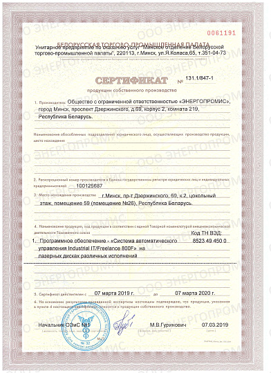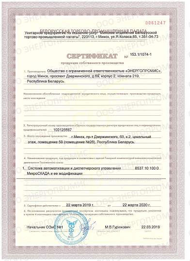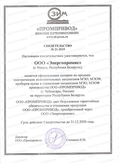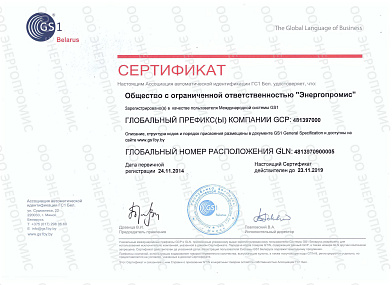 Свидетельство №21-2019 подтверждает, что ООО "Энергопромис" является официальным дилером по продаже электрических исполнительных механизмов МЭО, МЭОФ, приборов пуска и управления механизмов МЭО, МЭОФ производства ООО "ПРОМПРИВОД" (г. Чебоксары) на территории Республики Беларусь.Сертификат пользователя Международной системы GS1