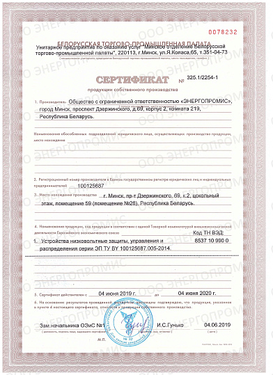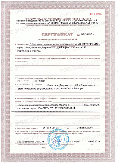 Сертификат собственного производства на устройства низковольтные защиты, управления и распределения серии ЭП ТУ BY 100125687.005-2014Бел ТПП. Шкафы микропроцессорной релейной защиты и автоматики серии ШЗА-ЭП