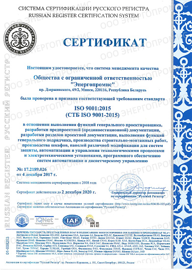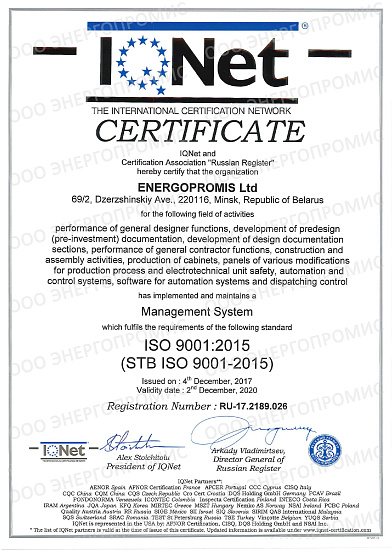 Сертификат соответствия требованиям СТБ ISO 9001-2015Сертификат IQNet (International Certification Network)