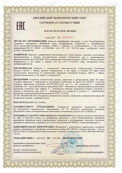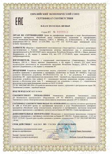 Сертификат собственного производства на устройства низковольтной защиты, управления и распределения серии ЭП различных модификаций и исполненийЕвразийский экономический союз. Устройства низковольтной защиты, управления и распределения серии ЭП