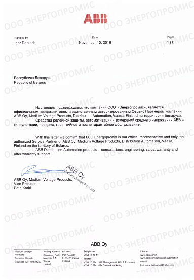 Официальное письмо от 10.11.2016 г., подтверждающее что ООО «Энергопромис» официальным представителем и единственным авторизованным Сервис Партнером компании ABB Oy, Meduim Voltage Products, Distribution Automation на территории Беларуси в части релейной защиты, автоматизации и измерений среднего напряжения ABB — консультации, продажа, гарантийное и послегарантийное обслуживание.ABB Сертификат Официального партнера (ABB AB Швеция)