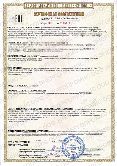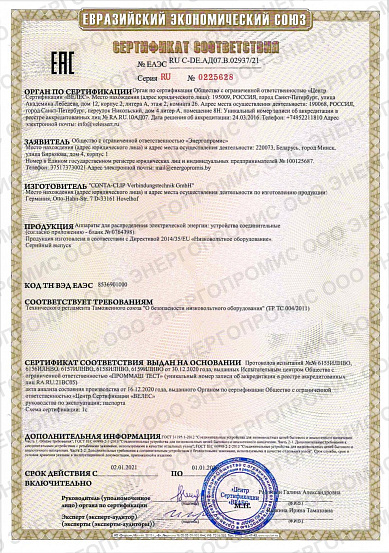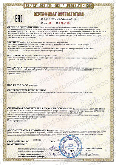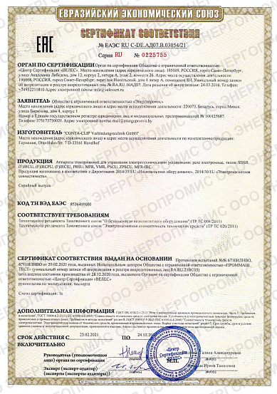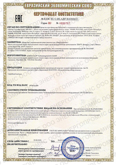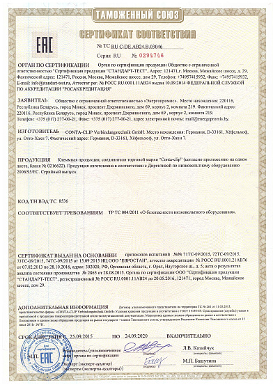 Сертификат соответствия EAC на клеммную продукцию и соединители торговой марки Conta-Clip, в том числе: перемычки серий SQI, Q, AQ, AQI, QSI, QI, QS, FQI, FIQI, ZQI, QSB, QVS, ZVQI, QSBI, QVSI; штекеры серий PS, KSS, KS-SQI; распределительные блоки серий SVB; адаптеры серий STL, PKB, PBT, STA, ZTA, TA, TAD, FTA; тестовые гнезда серий STA, STBI; соединительные втулки серии VH; зажимы серии ZB; клеммы серий SRK, RK, FRK, ZSRK, ZRK, ZRKS, RKB, BKA, KBL, SSL, SL, FSL, ZSLN, ZSL, ZSLS, MAG, SMAG, RKD, SRKD, RKDG, FRKD, ZRKD, SSLD, FSLD, ZSLD, IKD, DLI, ZIKD, VMAK, ZVMAK, IK, ZIZA, TRK, TK, FTRK, ZTRK, PTK, SPTK, STK, SIK, SSIK, FSIK, FIK, HSKG, HSK, ZMP, FDLI, FDLIS, TK, TKS, SIK/K, SK, TSK, FF/SF, D, EKB/EKBF, EKBBS, KKB, NT, FNT, FRKI, FSLI, ZST, ZSTK, ZRKS, ZSLS, SDK, PK, PKZ, PKD, PKH, PKDL, PKDR, PKDZ, PZK, PZKZ, PKT, PBK, PBKZ, PKBZ, STLZ, PK-TS, PFB, PFBZ, ISTLZ, PKBZ, IPKBZ, ZPL (ТС, до 24.09.2020г.)ПРОМПРИВОД Свидетельство официального диллера (г.Чебоксары, Россия)