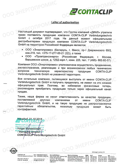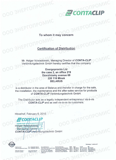 Письмо от 01.10.2018г. подтверждает, что ООО «Энергопромис» является официальным дистрибьютором продукции компании CONTA-CLIP Verbindungstechnik GmbH на территории Российской Федерации в части продвижения, распространения и реализацииCONTA-CLIP Сертификат дистрибьютора (Германия)
