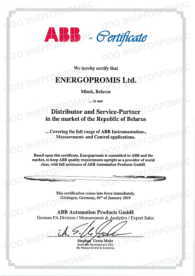 Сертификат от от 01.01.2018г. присвоении ООО «Энергопромис» статуса Дистрибьютора и Сервис-партнера в области поставки и обслуживания всей номенклатуры контрольно-измерительной продукции производства ABB Instrumentation.Условия данного сертификата обязывают ООО «Энергопромис» соответствовать требованиям качества ABB как мирового поставщика контрольно-измерительного оборудования. При полной поддержке и содействии ABB Automation Products GmbH (Германия)