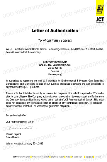 Письмо даёт право ООО "Энергопромис" представлять и продавать продукцию JCT Analysentechnik GmbH для отбора проб, кондиционирования и мониторинга технологических газов в качестве одного из квалифицированных и надежных партнеров.ООО "Энергопромис" имеет право участвовать в любых тендерных предложениях продукции JCT Analysentechnik GmbH.