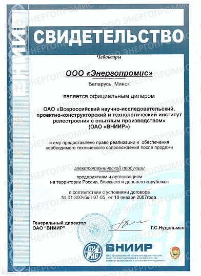 Свидетельство от 10.01.2007 г. подтверждает, что ООО «Энергопромис» является официальным дилером ОАО «Всероссийский научно-исследовательский и технологический институт релестроения с опытным производством» и ему предоставлено право реализации и обеспечения необходимого технического сопровождения после продажи электротехнической продукции предприятиям и организациям на территории России, ближнего и дальнего зарубежьяТаможенный союз. Сертификат соответствия. Реле промежуточные