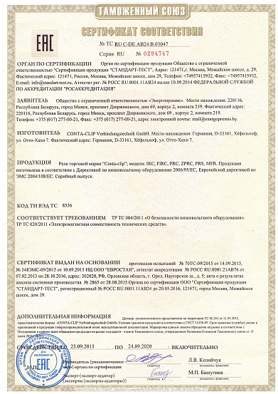 Сертификат соответствия EAC на реле торговой марки Conta-Clip моделей IRC, FIRC, PRC, ZPRC, PRS, MFR (ТС, до 24.09.2020г.)Таможенный союз. Сертификат соответствия. Клеммная продукция и соединители