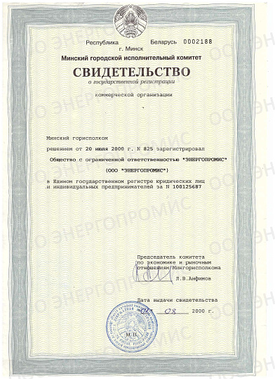 Свидетельство о государственной регистрации ООО «Энергопромис»