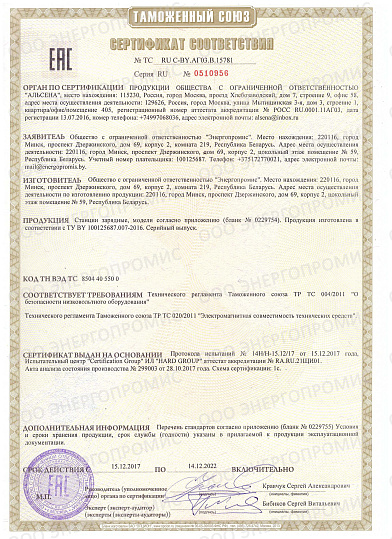 Сертификат собственного производства на станции зарядные различных моделей согласно ТУ BY 100125687.007-2016. Серийный выпуск.Таможенный союз. Шкафы микропроцессорной релейной защиты и автоматики серии ШЗА-ЭП